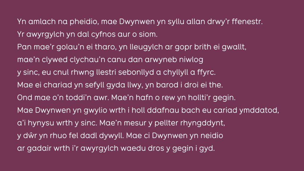 Yn amlach na pheidio, mae Dwynwen yn syllu allan drwy’r ffenestr.