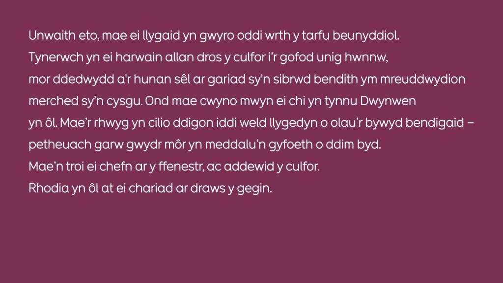 Un diwrnod yn ddiweddar, sylweddolais ’mod i wedi dechrau mwynhau’r defodau bach tawel o edrych ar ôl fy hun. Golchi ’nillad nes fod y cotwm yn wyn ac yn lân ac yn cario dim straeon; sgrwbio carreg y drws nes fod y lechen bron iawn yn ddu efo dŵr; golchi’r llestri y bûm i’n bwyta ac yn yfed ohonyn nhw, eu gwaredu nhw o fy hoel fy hun. Arogl sebon yn lle f’arogl i. Rydw i wedi mynd i awchu diffyg, hefyd – dim pethau del ar y waliau na blodau mewn jwg ar sil y ffenest, dim addurn na phatrwm ar ddillad na dodrefn, dim byd nad ydy o’n gwbl angenrheidiol. Am gysur ydi deall fod ’na gyn lleied sy’n angenrheidiol! Am gysur mewn cwpwrdd gwag, cynfas wen, y gorwel yn ymestyn yn gynnil ddestlus fel llinell dan ddiwedd stori.