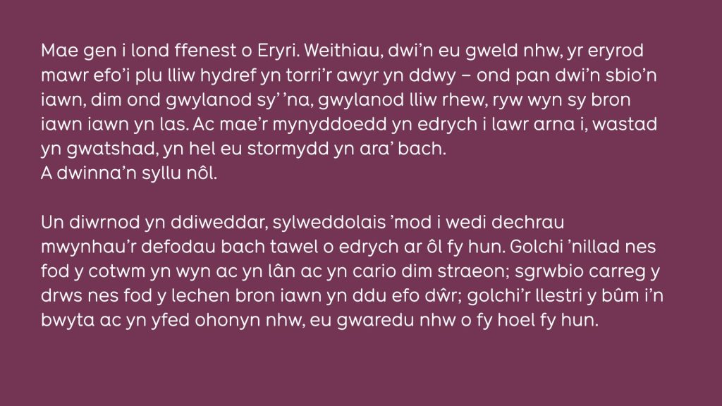 Mae gen i lond ffenest o Eryri. Weithiau, dwi’n eu gweld nhw, yr eryrod mawr efo’i plu lliw hydref yn torri’r awyr yn ddwy – ond pan dwi’n sbio’n iawn, dim ond gwylanod sy’ ’na, gwylanod lliw rhew, ryw wyn sy bron iawn iawn yn las. Ac mae’r mynyddoedd yn edrych i lawr arna i, wastad yn gwatshad, yn hel eu stormydd yn ara’ bach.