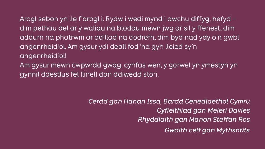 Cerdd gan Hanan Issa, Bardd Cenedlaethol Cymru. Cyfieithiad Cymraeg gan Meleri Davies,