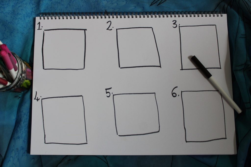 Cam 1: Darluniwch chwech bocs ar y papur. Y bocsys yma fydd yn dal eich stori chi. Labelwch y bocs 1-6.
