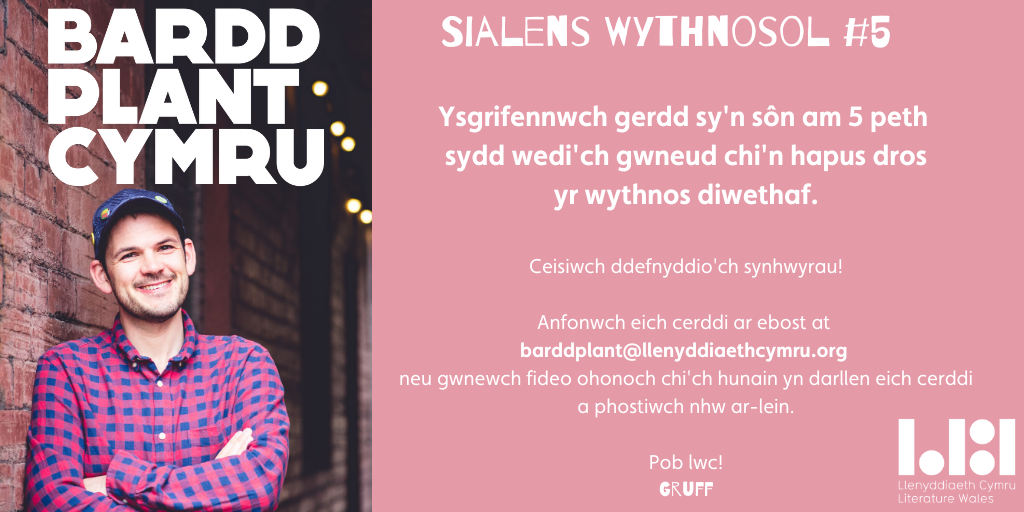 Bydd pob un sy’n anfon cerdd, stori neu adolygiad atom yn derbyn cerdyn post wedi’i lofnodi’n arbennig iddynt gan Gruff neu Eloise, a bydd rhai ohonynt yn cael eu recordio a’u rhannu ar-lein fel y gall Cymru a’r byd i gyd glywed pa mor wych yw’r straeon.