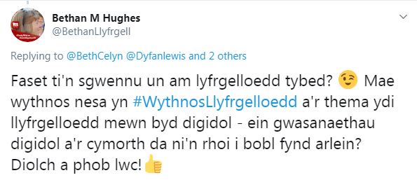 Mewn ymateb i gais gan Bethan M. Hughes ar Twitter: