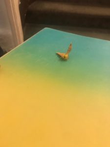 yn cuddio’n y gornel, tu ôl i’r banistyr,