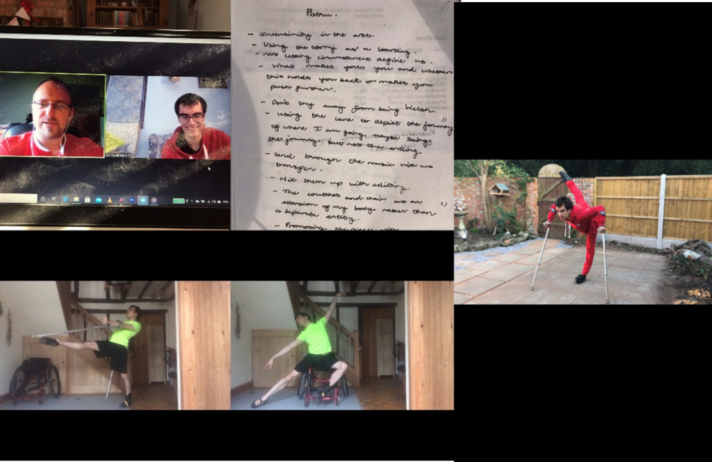 Gyda rhywfaint o nerfusrwydd, fel sy’n naturiol wrth gwrdd â rhywun am y tro cyntaf, ces fy nghyflwyno i’m partner dawns yn y prosiect hwn, sef Joe Powell-Main o Bowys. O’r cychwyn cyntaf roedden ni’n canu o’r un copi o’r caniedydd, yn cytuno ar weledigaeth o ran sut i fynd ati i greu dawns i gyfeiliant cerdd, neu yn wir, gerdd i gyfeiliant dawns. Roedd pŵer stori Joe yn glir o’r cychwyn cyntaf – sut y datblygodd anabledd yn ifanc ar ôl dechrau ei yrfa fel dawnsiwr, a sut y mae wedi goresgyn, ac yn parhau i oresgyn, ei anabledd ac yn defnyddio’i sefyllfa er gwell i fynegi ei hun trwy ddawnsio, boed yn defnyddio cadair olwyn neu faglau.
