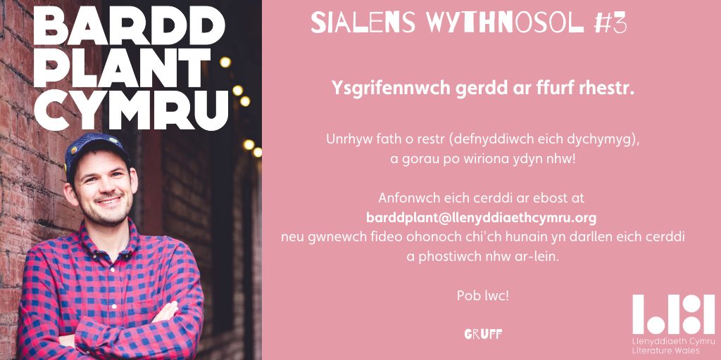 Bydd pob un sy’n anfon cerdd, stori neu adolygiad atom yn derbyn cerdyn post wedi’i lofnodi’n arbennig iddynt gan Gruff neu Eloise, a bydd rhai ohonynt yn cael eu recordio a’u rhannu ar-lein fel y gall Cymru a’r byd i gyd glywed pa mor wych yw’r straeon.
