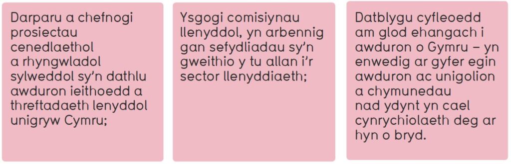 Byddwn yn ehangu ac ymestyn cyrhaeddiad ac enw da awduron Cymru, drwy wneud y canlynol: